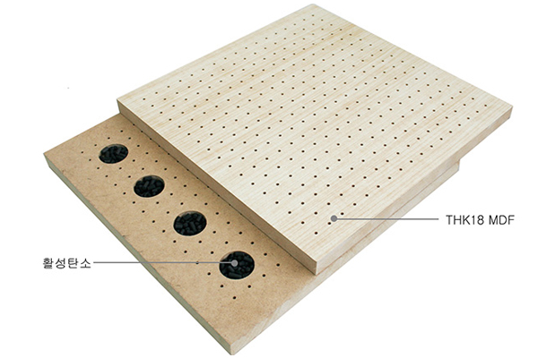 Acoustic Carbon은 내부에 들어 있는 활성탄소의 표면적(1㎡당 1,000,000㎡)으로 인해 18mm 두께로도 배후 공기층이 별도로 필요 없으며, 활성탄소의 표면적으로 인해 배후공기층을 극대화 시키는 효과를 가지고 있습니다.